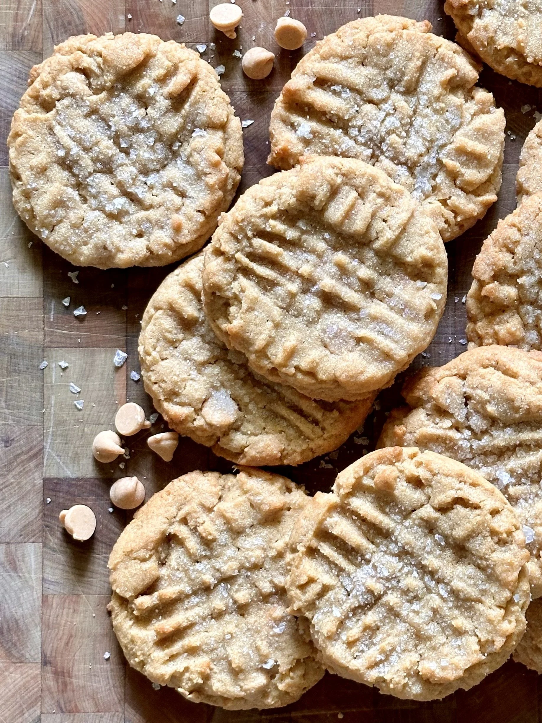 Creamy peanut butter meets peanut butter chips. Finished with a criss-cross pattern topped with sugar and sea salt.